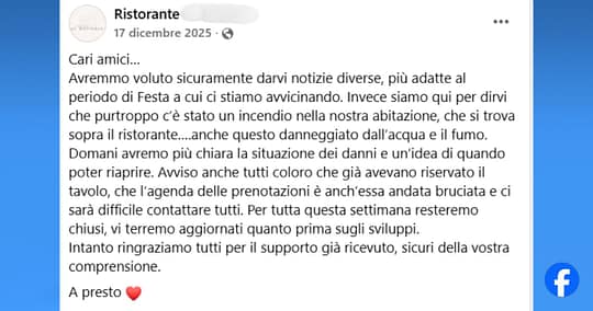 Il 17 dicembre, a pochi giorni dal Natale, un ristorante della provincia di Pordenone pubblica questo messaggio su Facebook: